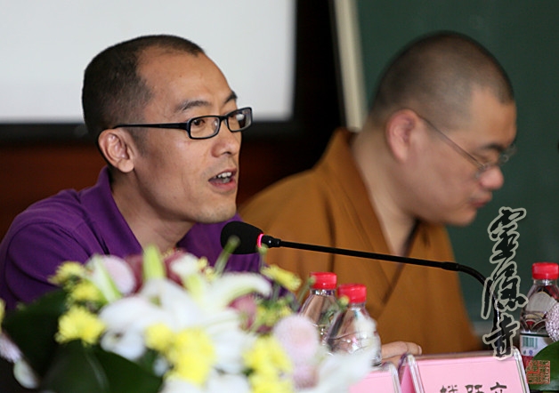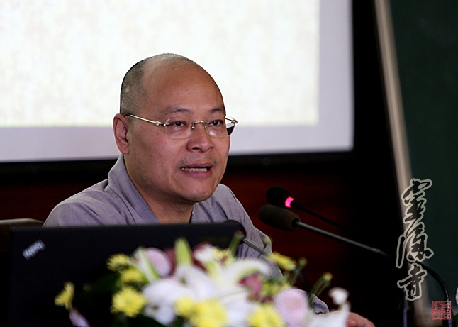上午9点,开班典礼在全场法师庄严的《三宝歌》声中开幕。楼跃文副处长首先代表省民宗委讲话,他对省佛协于弘一法师灵隐受具95周年之际在灵隐寺举办“戒律学培训班”,表示祝贺,并浅谈了自己对佛学的了解,他借莲池大师以干草、木头、铁、水、空比喻五种不同人对于名闻利养之火的态度,希望法师们通过学修,实现迈向“空”之境界的目的。