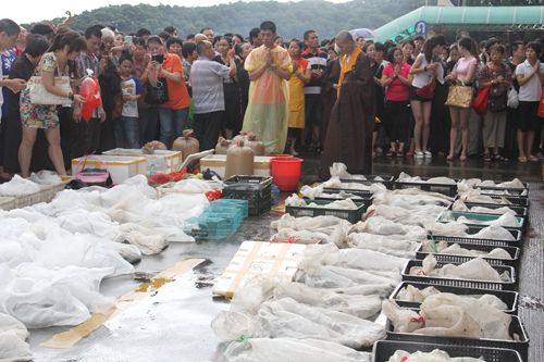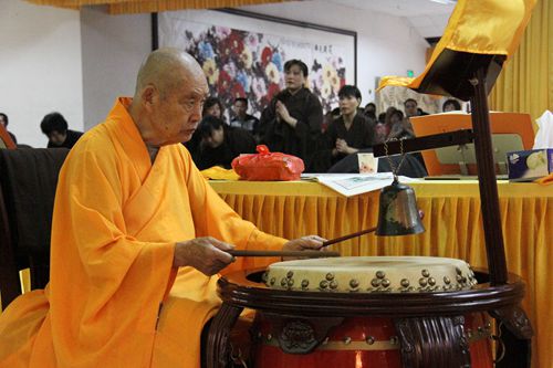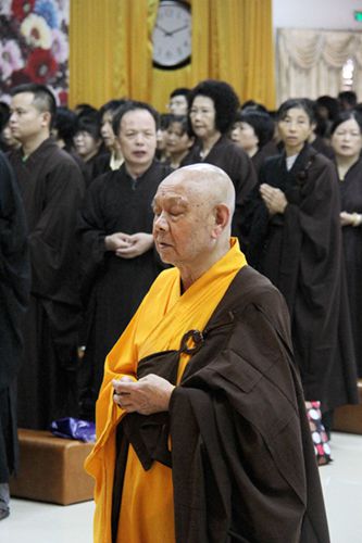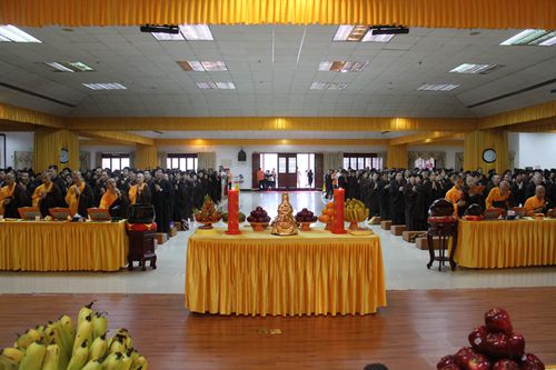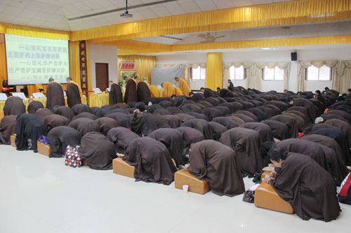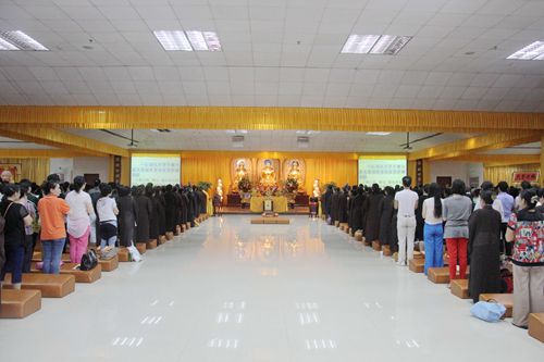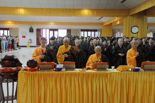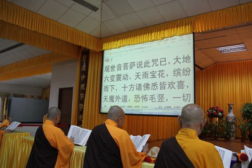 8点整,“大悲忏”法会正式开始。“南无过去正法明如来。现前观世音菩萨。成妙功德具大慈悲。於一身心现千手眼。照见法界。护持众生。令发广大道心。教持圆满神咒。永离恶道得生佛前。无间重愆。緾身恶疾。莫能救济。悉使消除。三昧辩才。现生求愿。皆令果遂。决定无疑。能使速获三乘。”随着经文观想及法师诗歌般优美的唱诵带领,躁动不安的心渐渐呈现宁静与祥和。大部分的信众身着肃穆的海青,神情恭敬,庄严法堂;“南无大悲观世音菩萨...”大众虔诚的讽诵回荡在道场,绕梁不绝。法会从当天早上8点到下午4:30分为若干个时间段,内容主要是拜大悲忏、消灾祈福、佛前大供及放生法会。共近千名佛子共聚于法堂拜大悲忏,忏悔自己无始以来的业障,为修行路上减少违缘障碍,祈福国泰民安,世界和平,身心清净,道业成就。