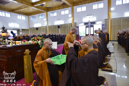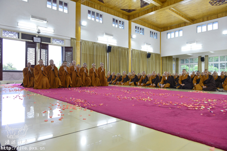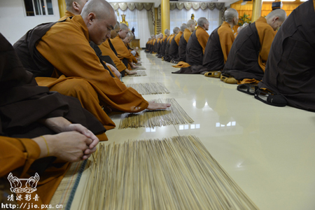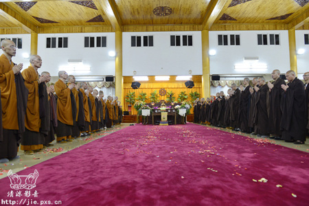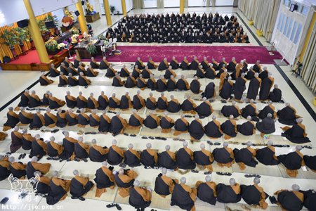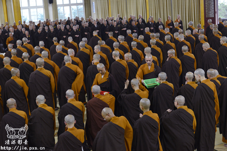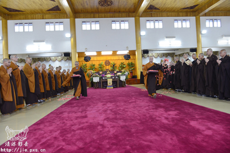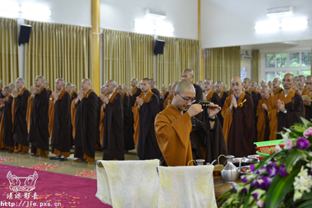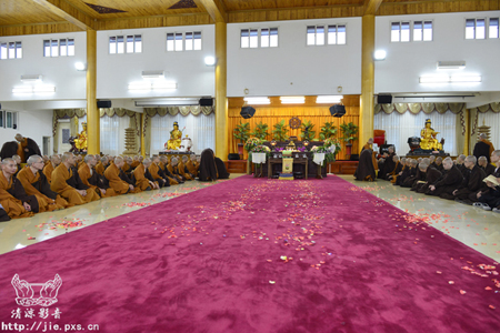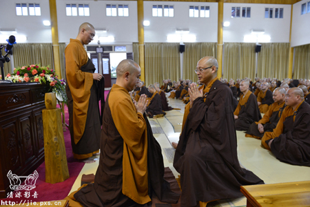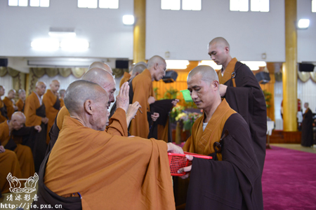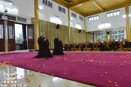 2013年农历七月十五日下午三时,平兴寺全体僧众于圆通殿举行结夏安居僧自恣仪式。三个月紧张有序的学习、共修,四百多人共聚一堂,非常殊胜难得。