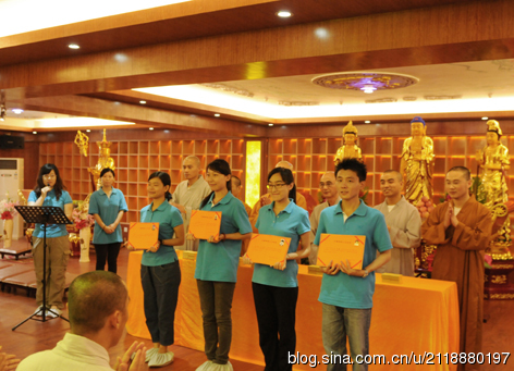 梵呗团三宝歌拉开了活动序幕。惟作法师宣布授证仪式开始,弘庵法师致词,对青年义工团给予厚望,希望义工团发扬行佛精神,共创人间净土,弘扬佛法,自利利他。随后,法师们为新进第二批义工颁发了义工证书,全体义工授予新版义工工牌。新进义工向大家讲述了自己与佛法和义工团结缘的经过以及今后志愿服务的工作愿望。
