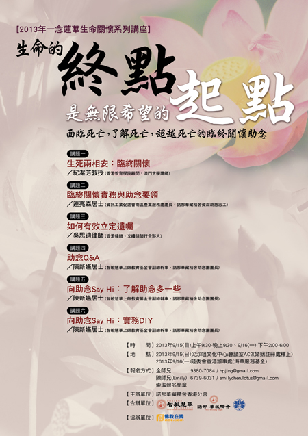 诺那华藏精舍香港分舍将于2013年9月15日和16日举办“2013年一念莲华系列关怀讲座”,让大众了解临终一念的重要性以及为什么要助念等讲题。让生命的终点成为无限希望的起点。