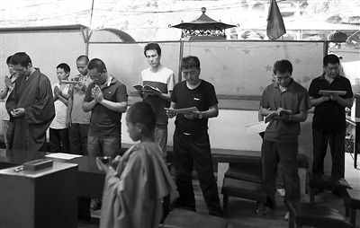 寺庙的晚课。第一次上晚课,这里的一切对于刚来的人而言,都是很新鲜的。(图片来源:新京报 摄影:韩萌)