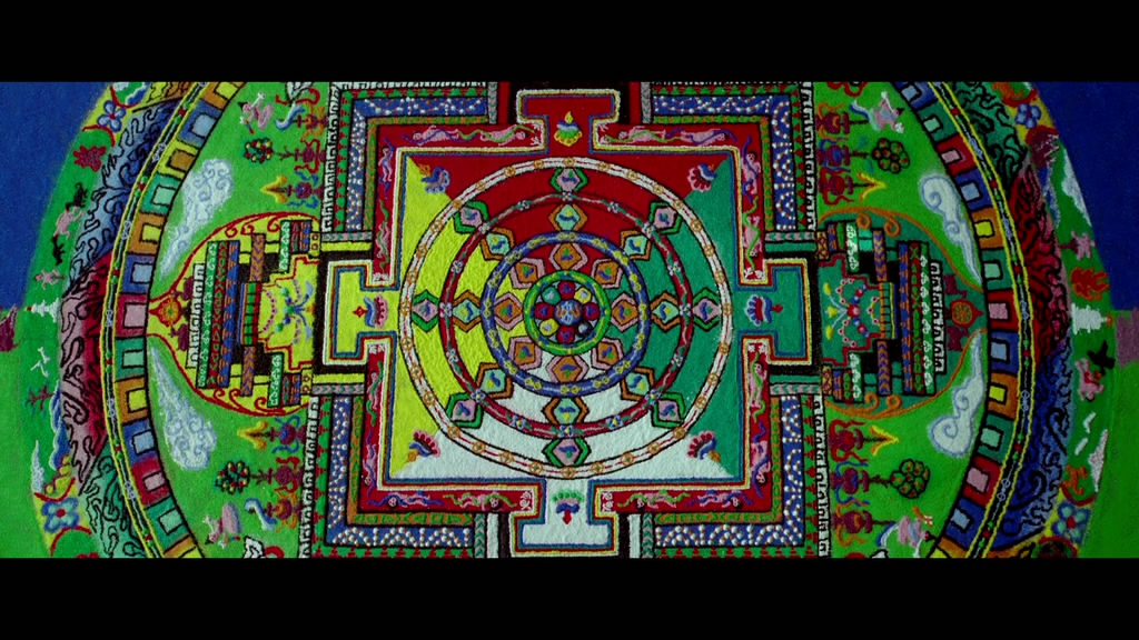 影片最后镜头又回到了华美绚烂而又精密有序的坛城沙画。然而,讶异的观众们此时看见,这个刚刚用沙子堆砌起来的世界,历经了积年累月呕心沥的创作,却在完成之后被毫不犹豫地全盘抹去。一件拥有无上艺术价值的作品,顷刻之间,便化为乌有。