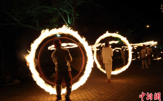 当地时间2013年8月19日,斯里兰卡康堤,民众载歌载舞,进行杂技表演等各种活动,庆祝佛牙节开幕。佛牙节游行在每年的7、8月份举行10天,数千名鼓手、舞者和杂技演员在大街上巡游,边走边进行表演。