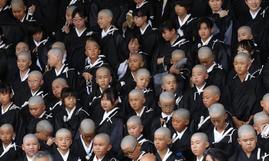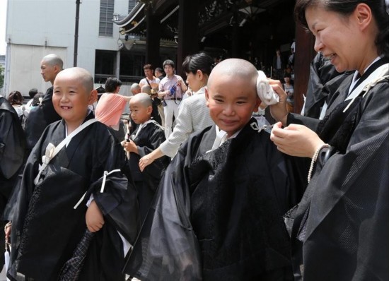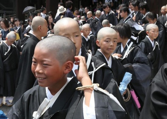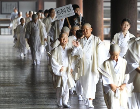 据悉,东本愿寺是日本佛教净土宗大谷派总寺院,因大谷派开山祖师亲鸾9岁曾剃度出家,所以满9岁的孩子就可参加此次“剃度仪式”。由于目前正在放暑假的日本中小学生比较多,大谷派决定将仪式分为2次举行。