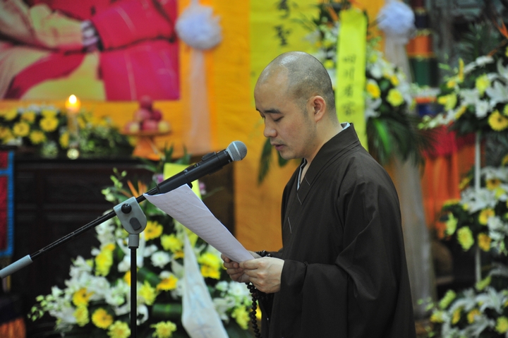 法会开始后,成都文殊院堂主宏开法师代表文殊院常住向所有出席追思法会的诸山长老、来宾以及在老和尚示寂后给予关怀和悼念的人士表达了由衷的感谢。稍后,文殊院方丈宗性法师致追思词。宗性法师怀着无比沉痛的心情,缅怀了老和尚的一生,高度赞叹了老和尚慈悲厚德的品格。他说,近30年来,老和尚在文殊院任职期间,协助宽霖老和尚撑持常住,倡导恢复丛林制度,坚持上殿过堂,推动布萨诵戒,修持严谨,行为众范,为文殊院劫后复兴做出了积极贡献。特别是宽霖老和尚圆寂后,鼎力维护常住,辅佐青年执事的工作,为转型中文殊院的平稳发展发挥了重要作用,深受僧俗佛弟子敬重。老和尚先后被礼请为四川省佛教协会第二、第三、第四、第五、第六、第八、第九、第十一、第十三、第十七届传戒法会、鸡足山祝圣寺首次传戒法会、梁平双桂堂首次传戒法会开堂、陪堂、尊证阿阇梨。老和尚一生精于音声佛事,梵呗造诣深厚,曾悉心整理寺院佛事活动中常用的唱赞,辑有《简明常用赞本》一册,广泛流布。老和尚一生慈悲柔和,爱护后学,深居简出,生活勤俭,常将自己的积蓄悉数用于供养三宝、捐建道场、扶危济困。最后,宗性法师号召大家学习老和尚的高尚品格,以老和尚的品格为典范,为文殊院的弘法事业不懈努力。