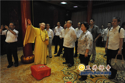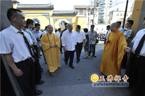 2013年8月15日下午,中国国民党荣誉主席吴伯雄先生一行在中共上海市委副秘书长莫负春、上海市人民政府台湾事务办公室主任李文辉等市领导的陪同下来到上海玉佛禅寺参观。中国佛教协会副会长、上海市佛教协会会长、上海玉佛禅寺方丈觉醒大和尚及中共上海市普陀区区委书记张国洪、统战部长郭芳等在玉佛禅寺山门前热情迎接。