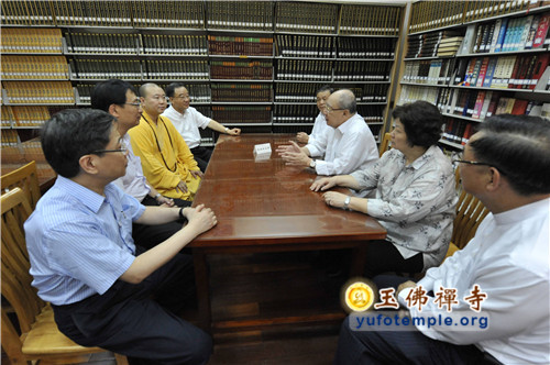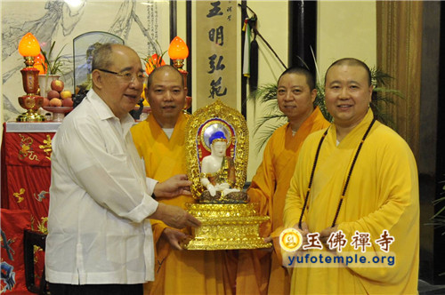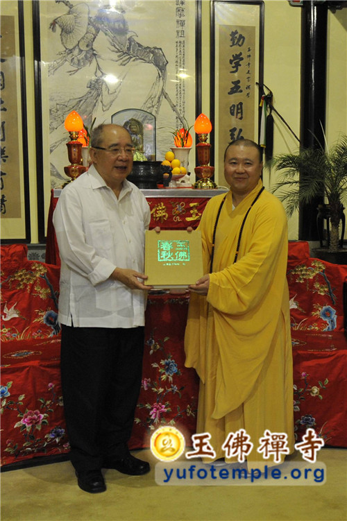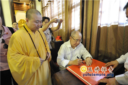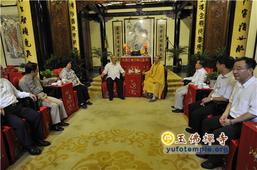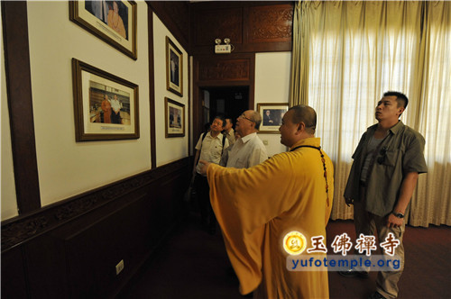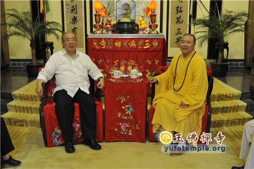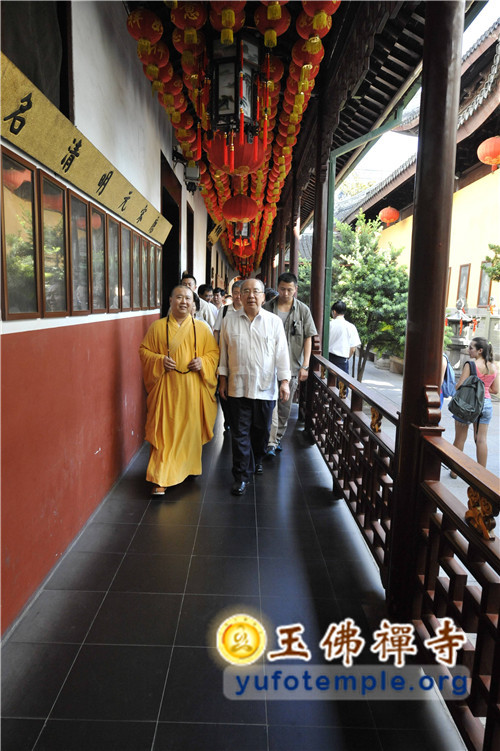 嘉宾到来后,觉醒大和尚等引领吴伯雄荣誉主席一行参观了寺内大雄宝殿、弘一图书馆、玉佛楼、觉群楼万佛堂等景点,随后宾主双方在方丈室小憩座谈。觉醒大和尚向客人简要介绍了玉佛禅寺的发展历史和现状,同时也说及上海佛教界和玉佛寺与台湾佛教界的友好交往,特别是玉佛寺与吴伯雄荣誉主席的师父、台湾佛光山开山祖师星云大师之间的交往,体现了两岸佛教法乳一脉、同宗同源的亲密关系。吴伯雄荣誉主席对玉佛寺的建设和景点也赞不绝口,认为在上海这样的大都市里,有玉佛寺这个清静、庄严的道场,对法师的修行,对满足佛教信众的精神需要,都是一件具有很大功德的事业。同时他也认为,佛教作为一个世界性的宗教,它的教理、教义,对于弘扬慈悲精神,维护世界的和平与稳定,都具有积极的意义。