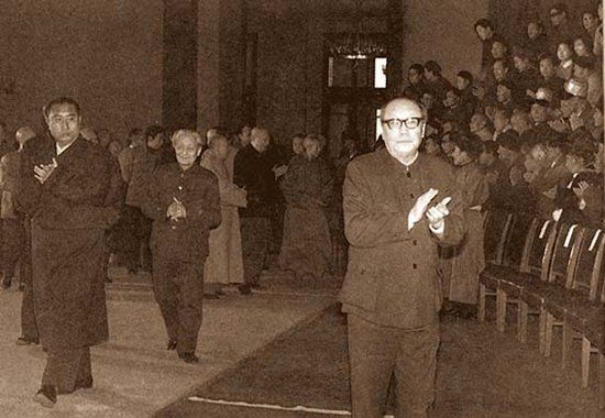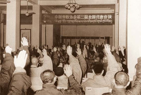 12月16日至23日,中国佛教协会举行第四届全国代表会议,出席会议的有来自全国29个省、自治区、直辖市包括汉、藏、蒙古、傣、满、裕固、纳西等民族的代表254人。会议通过了赵朴初作的《中国佛教协会第三届理事会工作报告》,修改了《中国佛教协会章程》,选出新的理事会和领导成员。班禅额尔德尼·确吉坚赞为名誉会长,赵朴初为会长。(图为全国人大常委会副委员长乌兰夫、阿沛·阿旺普美、第十世班禅额尔德尼·确吉坚赞会见全体代表)