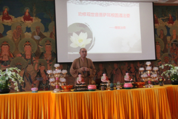 午后,本次禅修营导师本寺方丈曙提法师特别在同觉书院为大家做了题为《劝修耳根圆通法要》的专题讲座,法师首先为大家讲解了观世音菩萨法门的四种用功之法。然后法师继续为大家阐释耳根圆通禅法的源流,从《楞严经—耳根圆通章》到憨山大师闻水流声入道,再到印光法师推荐的“自念自闻”法,法师结合自身修学的体会,详细了教习了耳根圆通修法的要点,大众信心倍增,法喜充满。
