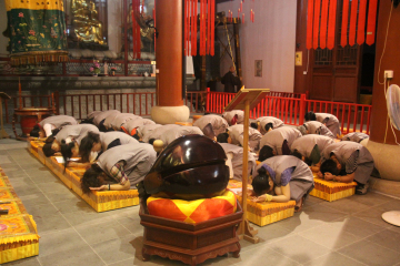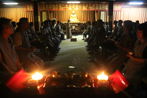 晚8时许,大众云集大雄宝殿,在清净的108声钟声中忏悔身心,洗涤心灵。以期自己能够身心清净,精进用功。 最后,随着止静板声的响起,营员们圆满而充实地度过了一天的禅修生活。