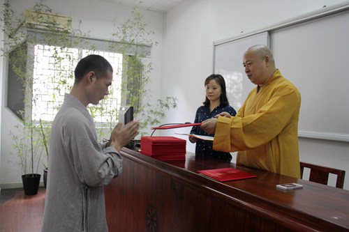 弘法网讯:2013年8月11号中午12:30分,经过21天紧张充实的学习,弘法寺佛学院第五届执事培训班即日圆满结业。在弘法寺佛学院第六课室,中国佛教协会副会长、弘法寺方丈印顺大和尚亲自为学员颁发结业证书。面对来自全国各地的40余名僧伽学员,印顺大和尚深情寄语,“今天的结业并不是结束,而是新的开始,希望大家能够做适应时代、融入社会的现代僧人,有激情、有责任感和使命感;希望大家都心怀梦想,都能做带头人,要有舍我其谁,敢于承担的精神,用每个人的激情和梦想点亮这个时代的激情与梦想,创造出未来无穷的世界。”