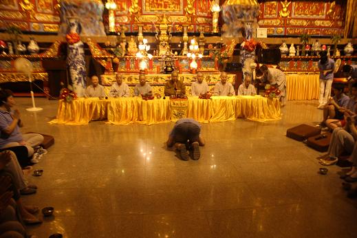 在金山寺的斋堂用斋完毕,9点,大家开始朝拜万佛塔。朝拜并不是迷信,而对佛的虔敬与感恩。诸相无常,人生本苦,是佛陀以他的大智慧教授我们以解脱之道,因而要像师长一般对佛陀充满感激和敬畏,而朝拜万佛正是此心。