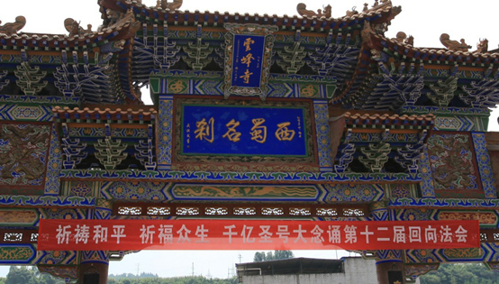 四川雅安云峰寺山门前悬挂着“祈祷和平、祈福众生、千亿圣号大念诵第十二届回向法会”横幅