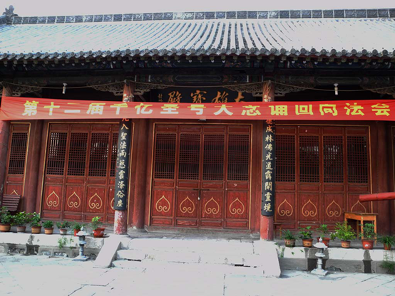 千佛寺大雄宝殿悬挂着“第十二届千亿圣号大念诵回向法会”横幅