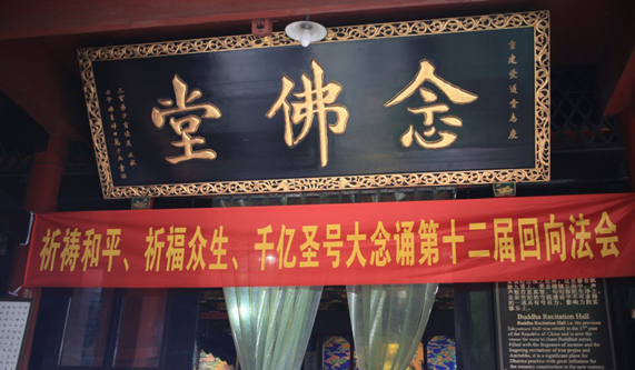 四川成都爱道堂念佛堂悬挂着“祈祷和平、祈福众生、千亿圣号大念诵第十二届回向法会”横幅