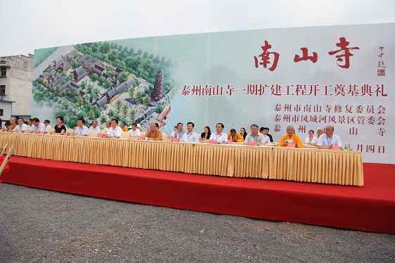 2013年8月4日上午,江苏省泰州南山律寺隆重举行复建奠基法会。中共泰州市委杨峰副书记,中共泰州市委常委卢佩民秘书长,原江苏省民宗局局长、泰州市南山寺修复委员会总顾问翁振进先生,泰州市人大陶幸蓉副主任,泰州市政府贾春林副市长、孔德平副市长等各级领导应邀出席法会,中国佛教协会副会长、江苏省佛教协会会长、镇江金山江天禅寺及焦山定慧寺方丈心澄法师,江苏省佛教协会副会长兼秘书长、苏州寒山寺及重元寺方丈秋爽法师,江苏省佛教协会副会长、泰州南山寺住持大初法师,江苏省佛教协会副秘书长、镇江宝华山隆昌寺住持心平法师,江苏省佛教协会副秘书长、南通观音山太平寺住持文定法师等来全国各地近千名四众弟子共同参加了法会。