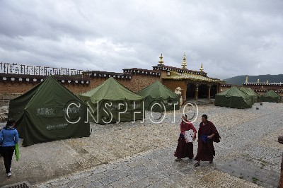 2013年9月2日,记者在位于香格里拉县城附近的噶丹·松赞林寺看到,受滇川交界带地震影响,这里的120多栋僧舍不同程度受损,其中四栋僧舍已成危房,寺内的721名僧人已基本疏散,留下值班的40多名僧人也搬进寺庙空地上搭建的救灾帐篷内居住。