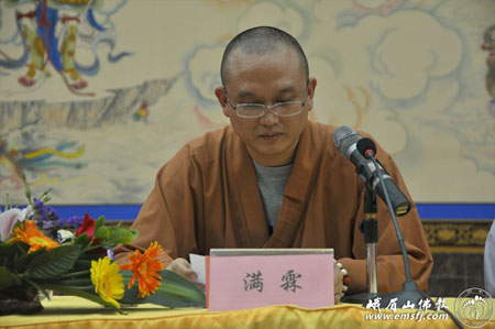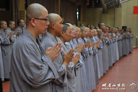 金秋八月、丹桂飘香,在这个收获的季节,峨眉山佛学院又迎来了一个新的学年。2013年9月9日下午,峨眉山佛学院2013年秋季开学典礼在峨眉山大佛禅院峨眉讲堂举行。参加此次开学典礼的有:四川省宗教局副局长杨伯明,中国佛教协会副会长、四川省佛教协会会长、峨眉山佛教协会会长、峨眉山佛学院院长永寿法师,四川省佛教协会秘书长、峨眉山佛学院副院长王立军,峨眉山佛教协会副会长心定法师、演法法师、宏开法师,峨眉山佛教协会副会长、峨眉山佛学院副院长满霖法师,峨眉山佛学院副教务长演妙法师,峨眉山佛学院全体法师、教师、各职能部门负责人及峨眉山佛学院全体学僧。活动由满霖法师主持。