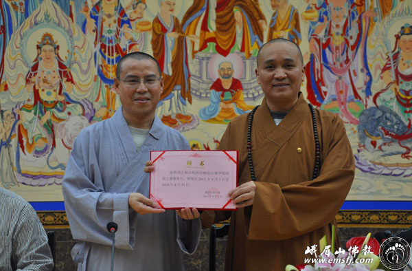 开学典礼在庄严的国歌声中正式开始。隆藏法师、王立军副院长分别宣读了关于峨眉山佛学院副院长人事任命的请示及同意批复;法源法师宣读峨眉山佛学院各职能部门负责人及秘书、班主任的人事聘任文件,并由永寿法师向以上聘任的各位法师、老师及工作人员颁发聘书。