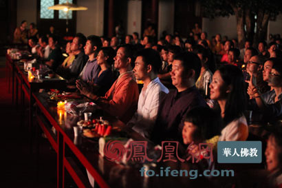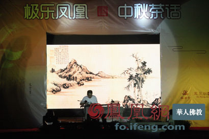凤凰网华人佛教与福建古田极乐寺联合举办的极乐凤凰话中秋活动现场,主持人与定空法师及居士探讨佛法。(图片来源:中新网)