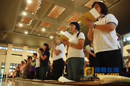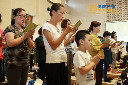 法鼓山于2013年9月29日下午2时在园区大殿,为近九百位虔心学佛的民众举办皈依祈福大典,典礼由方丈果东法师亲授三皈五戒,并赠予新戒弟子佛牌结缘,许多信众在颂念佛号时,欢喜流下感动的泪水。