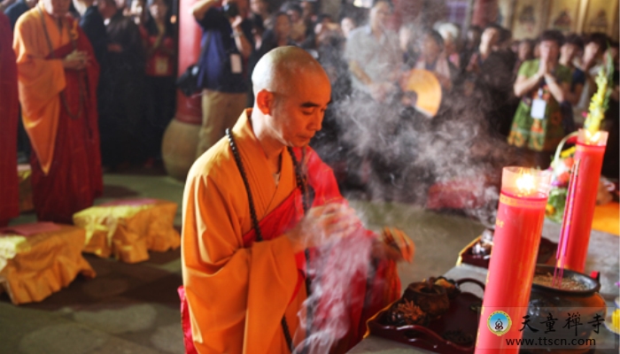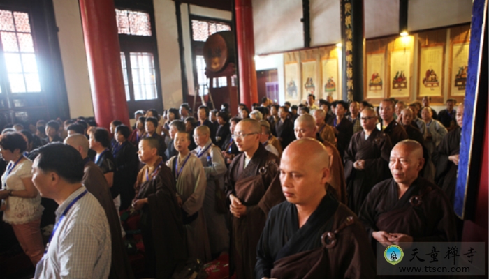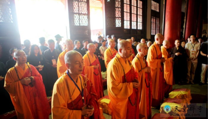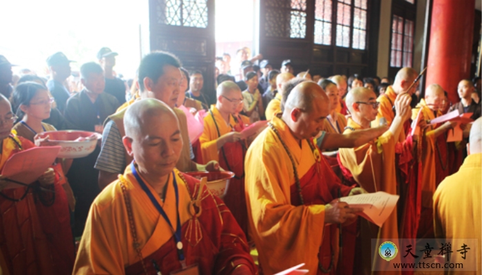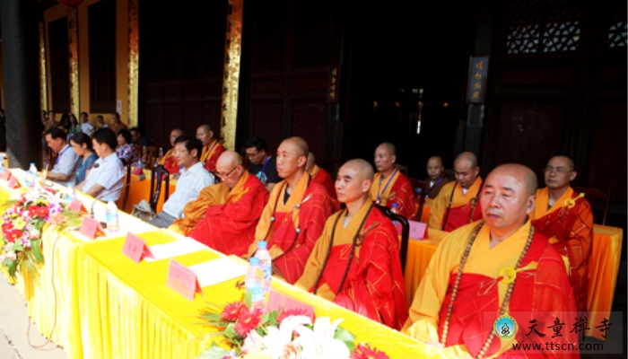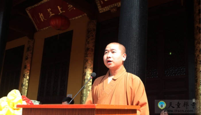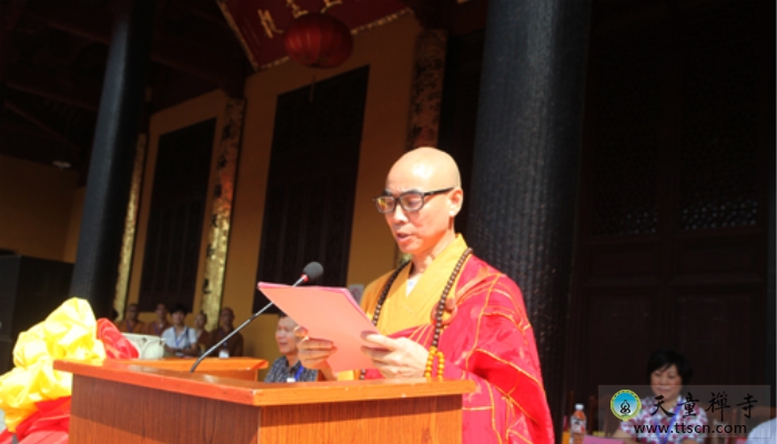 法会首先恭请浙江省佛教协会副会长、浙江慈云佛学院院长、宁波市佛教协会会长、天童禅寺方丈诚信大和尚致辞。大和尚首先感谢各级领导对此次活动的关心与支持,以及长期以来对天童禅寺护法的居士。随后介绍了影响整个中国佛教的领袖人物圆瑛老和尚的一生,老和尚一生弘法利生,研习和弘扬佛教各部经论,对近现代佛教的教育有非常大的指导意义,以“大慈悲、大无畏、大无我”的精神为弘法理念。爱国爱教,并在抗战期间,带领佛教四众弟子,真实的履行了一位佛教徒的义务,为中国佛教的后学们作了很好的时代表率。随后大和尚介绍了天童禅寺的历史和祖师,1700年成就了许多祖师,也成为中国禅宗的辉煌与光荣,特别是曹洞宗的弘扬,为天童禅寺在中国佛教的历史中奠定了重要的地位。