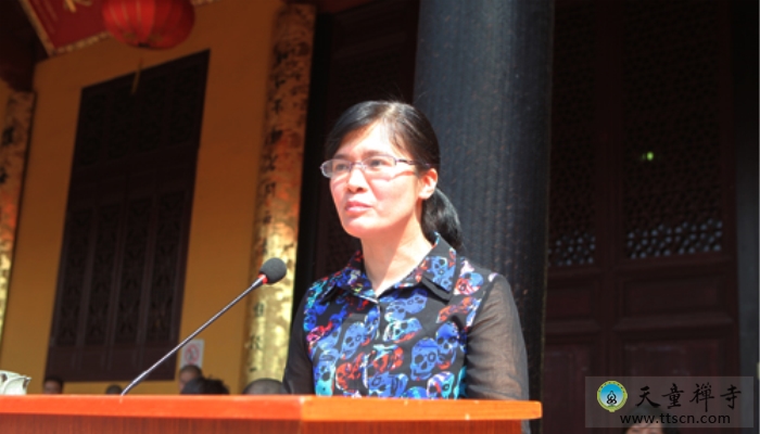 之后由宁波市鄞州区委常委、区人民政府蔡松芝女士代表政府部门发表讲话,对天童禅寺的历史和历代住持在宁波佛教的弘扬和社会中的指导价值作了肯定,并预祝开光法会圆满成功。