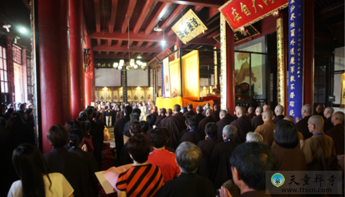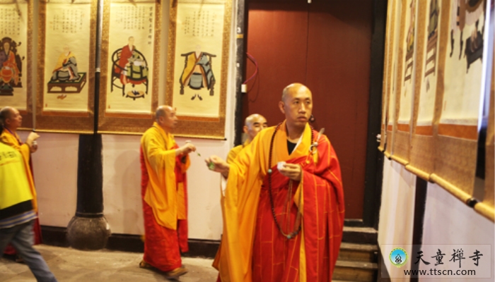 庆典仪式之后,在天童禅寺法堂,举行了“天童历代住持顶相开光法会”。法会礼请了诚信大和尚、怡藏大和尚、了法大和尚等10位高僧大德,共同主法为顶相开光。诸位大和尚遍洒杨枝,大众讽诵经咒,依照仪规,如法举行开光。梵音嘹亮,在场的佛教四众弟子共同见证了吉祥的一刻。