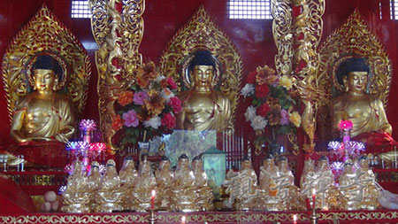 由于观音禅寺目前正在建设中,寺院内尘土飞扬,大雄宝殿佛像尚未贴金,临时佛殿空间狭小,夏季不适合举办佛事,故在释一莲法师住持的另一座寺院金华寺举行地藏王菩萨圣诞日超度祈福法会。