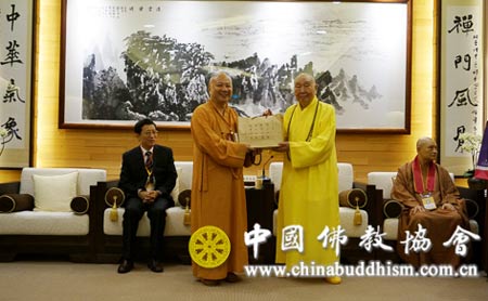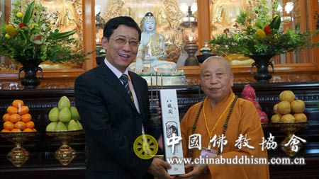 2013年9月9日下午16时,大陆佛教代表团一行到台湾中国佛教会参访,双方进行了亲切友好的会谈。台湾中国佛教会理事长圆宗长老对大陆佛教代表团一行的到访表示热烈欢迎,并在会谈中深情回顾了台湾佛教界与大陆佛教界友好往来的历史。代表团团长明生法师、顾问蒋坚永先生先后讲话,对圆宗长老和台湾中国佛教会的热情招待表示感谢。