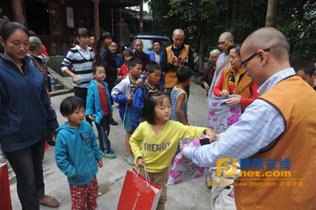 经过近4个月的筹备,由成都文殊院福慧功德会组织的“芦山灾区秋季爱心助学活动”于2013年9月8日正式启动。助学小组一行16名志工在福慧功德会负责人庆妙法师的带领下,前往雅安庐山佛图寺及上里箭杆林小学,不仅为芦山地震灾区75名贫困学生发放了助学金98700元,还赠送孩子们书包、文具、图书等学习用品,为他们的新学期送上爱的祝福,正式拉开文殊院的“9月慈善推广季”。