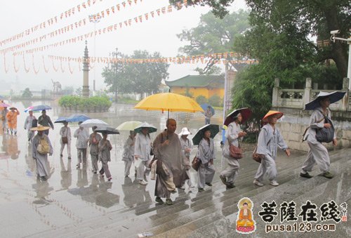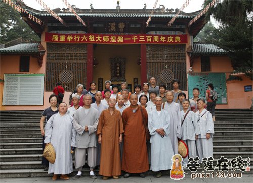 下午两时四十分,队员行脚团风雨兼程,终于来到了禅宗祖庭南华禅寺,队伍排班列队整齐的步入山门,来到客堂到。9月7号这里举办 “纪念六祖惠能圆寂1300周年暨2013广东禅宗六祖文化节”大型法会,闻讯来此参会者众多,客堂早已止单。常住慈悲,格外照顾我们这支千里迢迢徒步朝圣的队伍,帮我们安住下来,安排八位比丘法师住进了禅堂,在法会期间这是最高的礼节,又安排其余的26位队员住进义工楼,大家非常的满足,非常的感恩。常住还破例让我们到六祖肉身殿礼拜六祖真身,(法会期间六祖肉身殿不对外开放。)队员们怀着无比崇敬、激动的心情敬香,拜佛、绕佛,费尽千辛万苦走到这里终于得见祖师真颜,那种心情无法言表,热泪盈眶,深深拜倒尘埃……