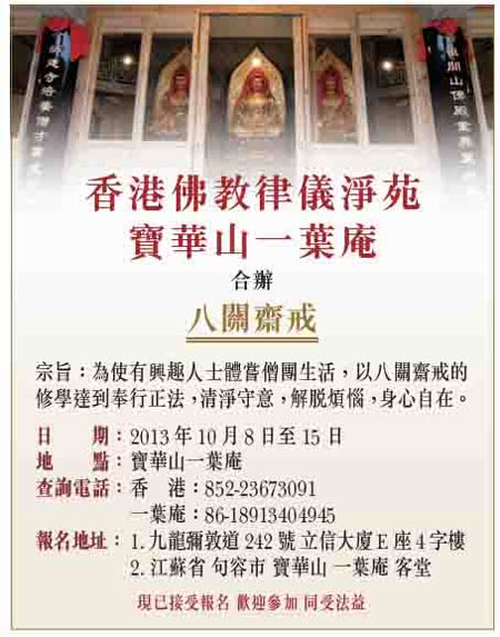 2013年10月8日至15日,香港佛教律仪净苑、江苏句容宝华山一叶庵将联合在一叶庵举办八关斋戒活动。
