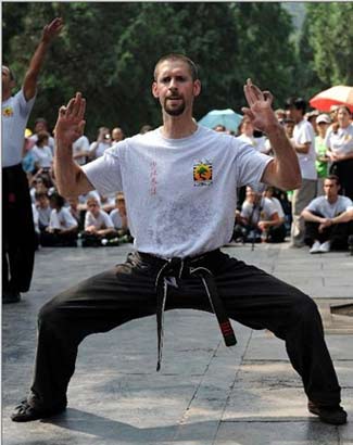 来自西班牙的卡洛斯•阿尔威利斯是西班牙四所少林武校的校长,练习少林功夫已经有十年时间。3年前,他来到少林寺修行功夫、研习佛法,想从源头探寻功夫的真谛。就在上个星期,他正式皈依少林寺,成为一名洋弟子,释永信赐他法号“延雅”。