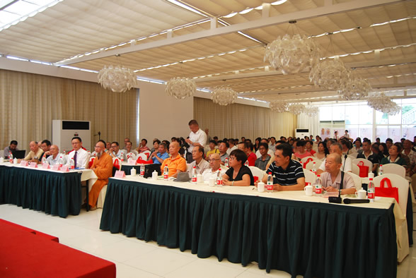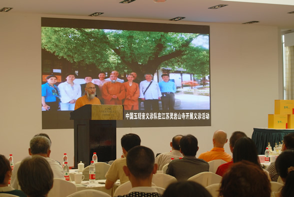 中国玉观音义诊队76岁高龄的俞老师报告了义诊队的发展历程和目前开展义诊的情况。浙江省天台县文联主席陈虹先生的书面祝贺,对智渡法师近年来为文化推广所做的辛勤劳动及其《佛门探宝》一书作了高度评价。