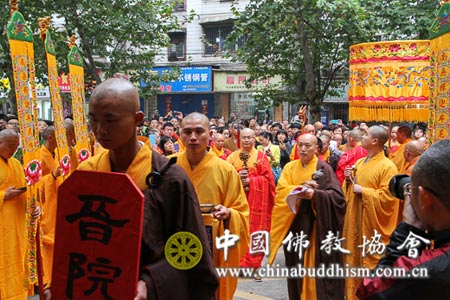 上午8时,升座法会正式拉开帷幕。九江能仁寺全院执事及全寺僧俗两序大众在山门前列队恭请普钰法师慈悲晋院,普钰法师默然应允。诸山长老向普钰法师授祖衣、念珠、如意、佛尘、钵、具、锡杖、龙杖等。随后,普钰法师在仪仗队的引领与众嘉宾的簇拥下缓缓行至各殿拈香礼拜,卓杖说法。九江能仁寺居士信众夹道欢迎,向普钰法师合十致敬。当普钰法师在仪仗队的导引下来到设在大雄宝殿后的法堂时,无相长老为普钰法师送位,辉悟长老为普钰法师送座。随后,普钰法师登上法座拈香说法,正式荣膺九江能仁寺新任方丈。