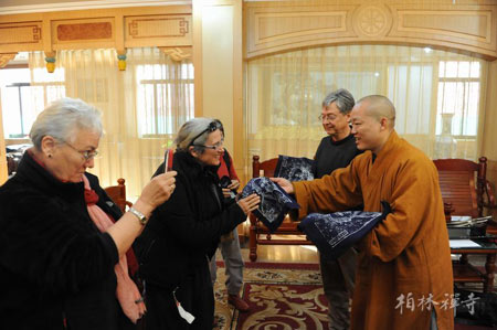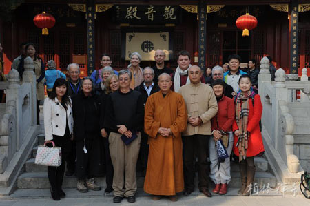 次日上午,传学法师带领团员坐禅;午间,明海法师在指月楼与参访团一行进行了两个多小时的英文座谈。期间,大众还欣赏了二胡演奏和太极拳表演。座谈结束后,大家互赠纪念品并在观音殿前合影留念。