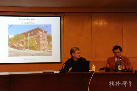 下午,明海法师在普贤阁为禅修团讲解禅堂仪规并作禅修辅导。晚间,冯克强先生为常住大众作关于“Zen in the West ”(西方的禅)的讲演,详细介绍了被译为“参与佛教”的“Engaged Buddhisim”。同时,正在给佛学院授课的朱彩方博士也一起进行了广泛的探讨,讲演与研讨在热烈的气氛中圆满结束。
