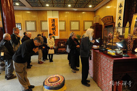 2013年10月25日至26日,来自大洋彼岸的美国禅修团二十余人到河北赵县柏林禅寺参学,受到柏林禅寺方丈明海法师和知客持顺法师的热情欢迎。禅修团由美国旧金山禅修中心成员、汉学家冯克强(中文名)先生带领,这是他第九次率团参访柏林禅寺。