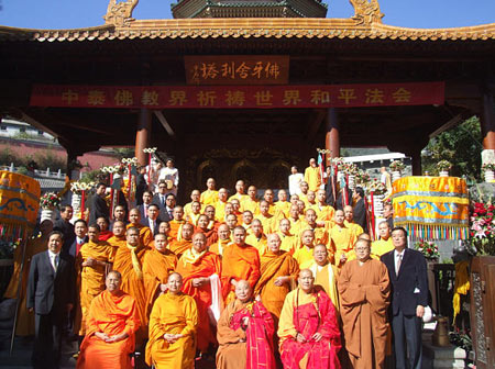 会谈结束后,双方在佛牙舍利塔下举行祈祷世界和平、国泰民安法会。法会前,传印会长和帕·菩拉玛攀迪长老作重要开示,并共同拈香礼佛,两国僧人以不同语言先后诵经,共同为世界和平、众生安乐祈福。法会现场,圣神庄重、法喜无量。