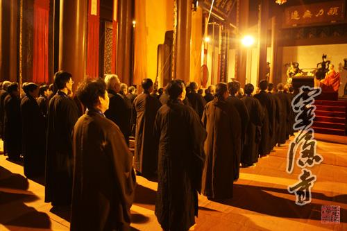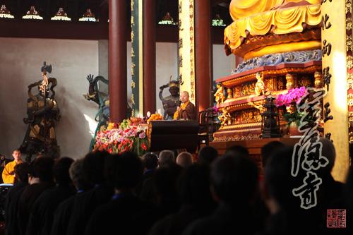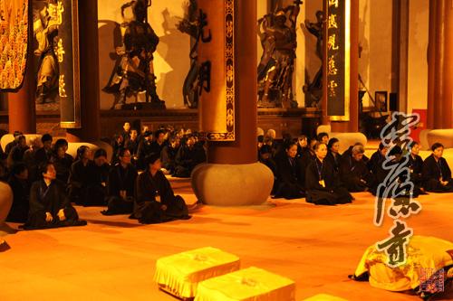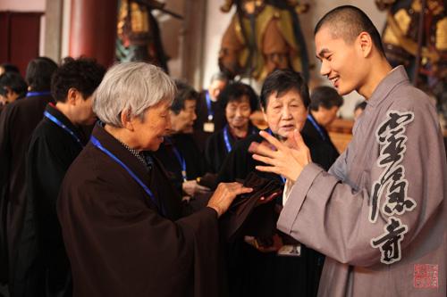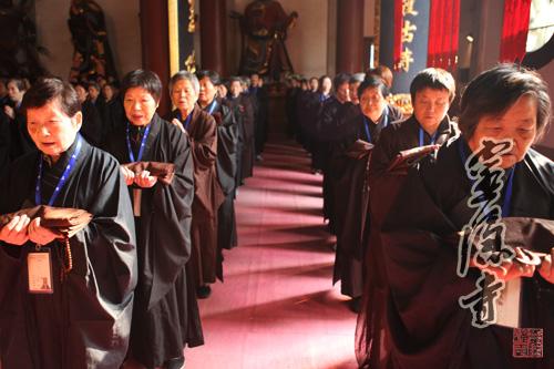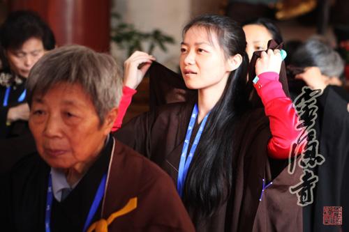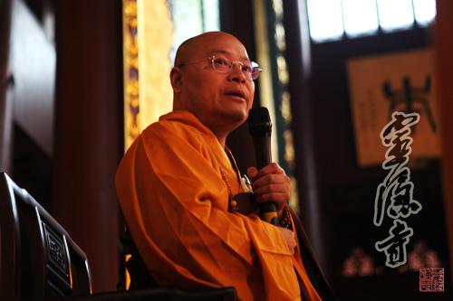 2013年10月20日,农历九月十六,灵隐寺癸巳年传授护国兴圣二部僧三坛大戒法会第二十五天:讲比丘戒,菩萨戒居士听和尚开示、学习穿海青搭衣。