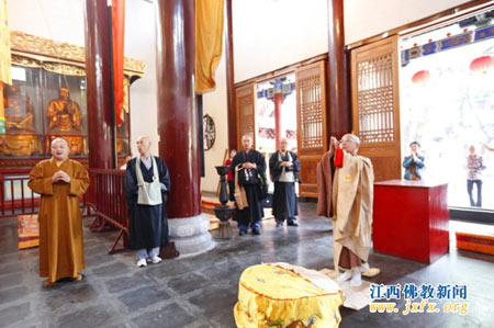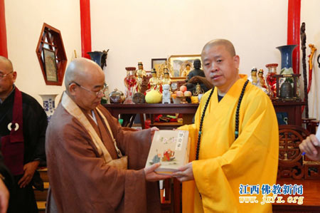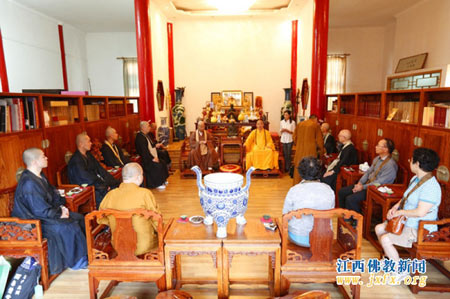 纯一法师向客人简要介绍了江西禅宗的历史与近况,提供了有关历史资料和书籍。泽大道长老说,他本人是84年第一次来江西参访的,至今已先后来了七次,每次看到江西禅宗祖庭的恢复和新气象,他都感到由衷的高兴,他真诚的祝愿江西的佛教事业和禅宗文化能够取得更好的成绩。之后,他们将赴靖安宝峰寺、奉新百丈寺、宜丰洞山普利寺和黄檗山黄檗禅寺,宜春仰山栖隐寺,萍乡杨岐山等祖庭参访。