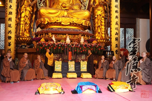 下午14时,在开堂大师傅及诸引礼师的教授下,新戒们在法堂练习登坛仪,为明日正式登坛受具足比丘戒演仪。