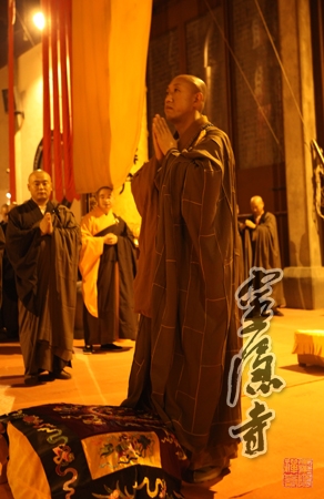 晚上,戒子们在药师殿聆听教授和尚中国佛教协会常务理事、浙江省佛教协会会长、雪窦寺方丈怡藏大和尚开示,并在开堂大师傅的引信下,拜愿忏摩通宵。
