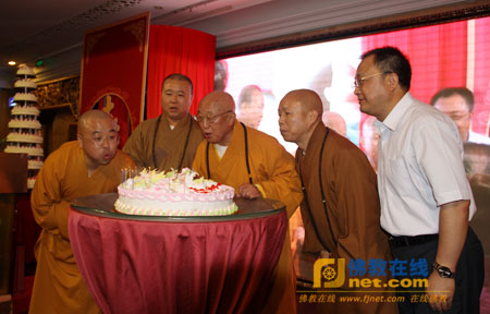 松纯长老、 觉醒法师、心澄法师、净芳法师、赵世平局长一起吹灭了生日蜡烛。(图、文:唐明、秦华)