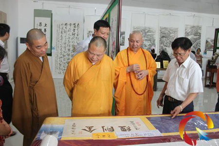 原广东省民委主任(右一)刘文炎陪同各位法师参观画展