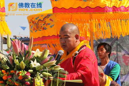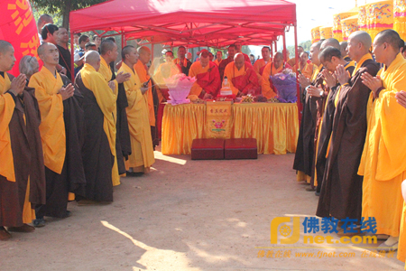 10点30分,在热烈欢喜的气氛中,诸山长老、各级领导与嘉宾,共同环绕在奠基石周围,演觉法师、证道法师和大愿法师宣说奠基法语毕,大家共同为目莲寺斋堂僧寮奠基。奠基仪式完毕,大众供上堂斋一堂,礼请大愿法师登狮子座,上堂说法,广利群生。