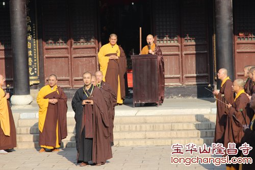 2013年10月22日,江苏宝华山隆昌寺传授三坛大戒法会第十五天。开堂大初法师,陪堂定真律师,首堂慧泉律师,以及诸位引礼师父,教礼——二坛正授、演坛。