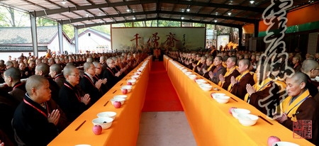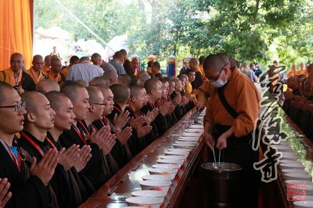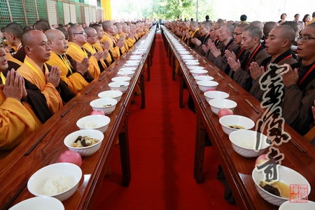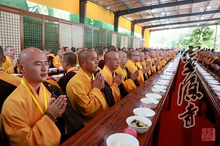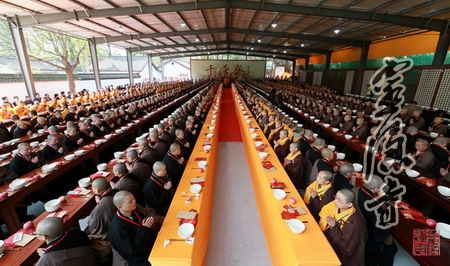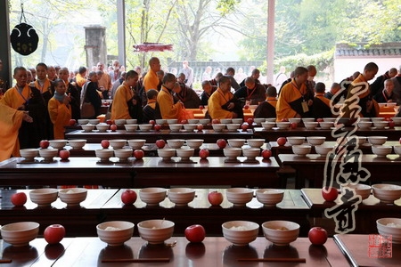 当天中午,设在三坛大戒教礼场的千僧斋会场,僧衣飘动,佛号庄严,威仪具足,法喜充满。参加2013汉传佛教讲经交流会的中佛协长老、讲经法师,参加癸巳年灵隐寺暨法镜寺三坛大戒法会的新戒大比丘,以及来自杭州佛教界的清净僧们,前来应供。